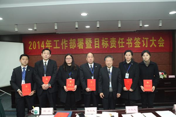 高玉祥副院长对2014年学院工作做了全面部署,明确了学院2014年度的“三大任务”、“四项目标”。院领导宣读了2014年度机构调整、人员聘任的通知,颁发了大部级、处级、科级任命书。随后,各处室负责人与分管院领导签订了2014年度部门工作目标责任书。